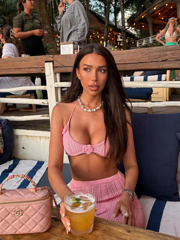 Beach vacation bikini two-piece set flower strappy long skirt hand-crocheted flower set